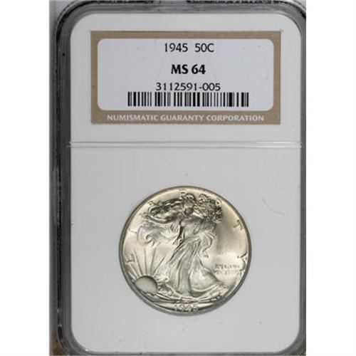 <B>1945 50C MS64 NGC.</B></I> NGC Census: (2992/4774). PCGS Population (4907/5961). Mintage: 31,502,000. Numismedia Wsl. Price for NGC/PCGS coin in MS64: $48. (#6624)<BR><BR><B>Coin Engraver:</B> Adolph A. Weinman<BR><BR><b>Shipping:</b> Coins & Currency (<a target="_blank" href="http://www.heritageauctions.com/common/shipping.php">view shipping information</a>)