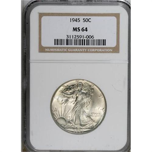 <B>1945 50C MS64 NGC.</B></I> NGC Census: (2992/4774). PCGS Population (4907/5961). Mintage: 31,502,000. Numismedia Wsl. Price for NGC/PCGS coin in MS64: $48. (#6624)<BR><BR><B>Coin Engraver:</B> Adolph A. Weinman<BR><BR><b>Shipping:</b> Coins & Currency (<a target="_blank" href="http://www.heritageauctions.com/common/shipping.php">view shipping information</a>)