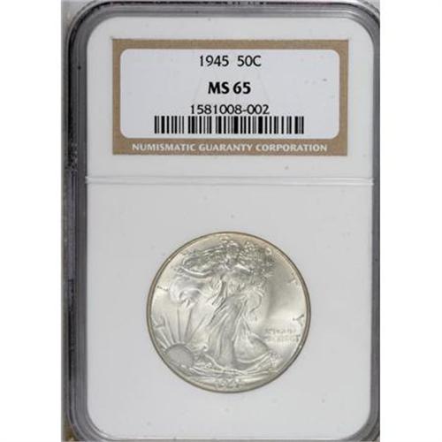 <B>1945 50C MS65 NGC.</B></I> NGC Census: (3598/1216). PCGS Population (4676/1310). Mintage: 31,502,000. Numismedia Wsl. Price for NGC/PCGS coin in MS65: $135. (#6624)<BR><BR><B>Coin Engraver:</B> Adolph A. Weinman<BR><BR><b>Shipping:</b> Coins & Currency (<a target="_blank" href="http://www.heritageauctions.com/common/shipping.php">view shipping information</a>)