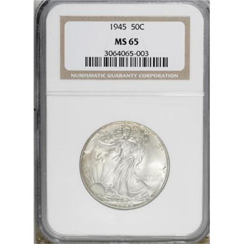 <B>1945 50C MS65 NGC.</B></I> NGC Census: (3599/1216). PCGS Population (4689/1314). Mintage: 31,502,000. Numismedia Wsl. Price for NGC/PCGS coin in MS65: $135. (#6624)<BR><BR><B>Coin Engraver:</B> Adolph A. Weinman<BR><BR><b>Shipping:</b> Coins & Currency (<a target="_blank" href="http://www.heritageauctions.com/common/shipping.php">view shipping information</a>)