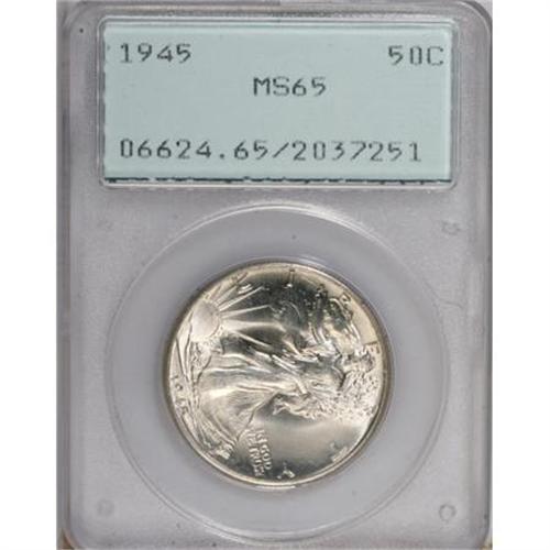 <B>1945 50C MS65 PCGS.</B></I> PCGS Population (4633/1297). NGC Census: (3567/1207). Mintage: 31,502,000. Numismedia Wsl. Price for NGC/PCGS coin in MS65: $135. (#6624)<BR><BR><B>Coin Engraver:</B> Adolph A. Weinman<BR><BR><b>Shipping:</b> Coins & Currency (<a target="_blank" href="http://www.heritageauctions.com/common/shipping.php">view shipping information</a>)