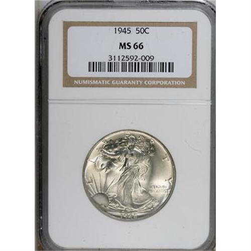 <B>1945 50C MS66 NGC.</B></I> NGC Census: (1125/82). PCGS Population (1247/59). Mintage: 31,502,000. Numismedia Wsl. Price for NGC/PCGS coin in MS66: $200. (#6624)<BR><BR><B>Coin Engraver:</B> Adolph A. Weinman<BR><BR><b>Shipping:</b> Coins & Currency (<a target="_blank" href="http://www.heritageauctions.com/common/shipping.php">view shipping information</a>)