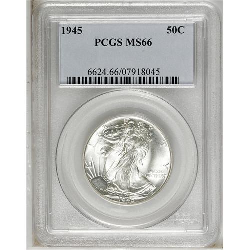 <B>1945<50C> MS66 PCGS.</B></I> A brilliant and beautiful Premium Gem, sharply struck except for the usual weakness on the branch hand. The obverse is remarkably void of marks, and the reverse is also clean.