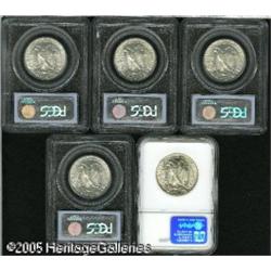 <B>1945 50C MS66 PCGS,</B></I> four coins, and a <B>1945 MS66 NGC,</B></I> all ranging from lightly patinated to brilliant. Premium Gem short set Walkers have enjoyed a spike in demand over the past year or so. 5 Coins Lot:8162