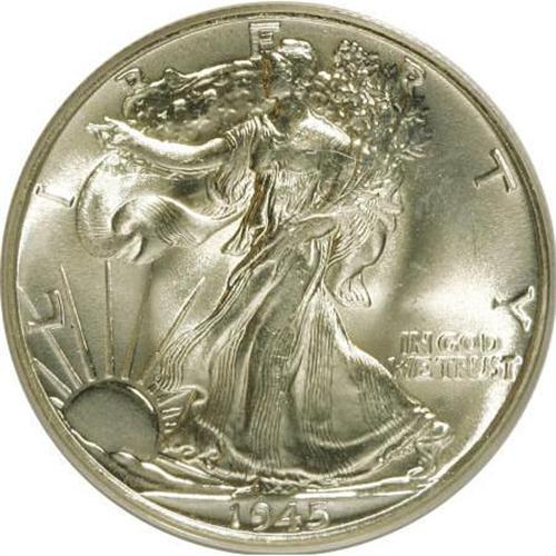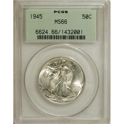 <B>1945 50C MS66 PCGS.</B></I> PCGS Population (1234/59). NGC Census: (1124/82). Mintage: 31,502,000. Numismedia Wsl. Price for NGC/PCGS coin in MS66: $200. (#6624)<BR><BR><B>Coin Engraver:</B> Adolph A. Weinman<BR><BR><b>Shipping:</b> Coins & Currency (<a target="_blank" href="http://www.heritageauctions.com/common/shipping.php">view shipping information</a>\)