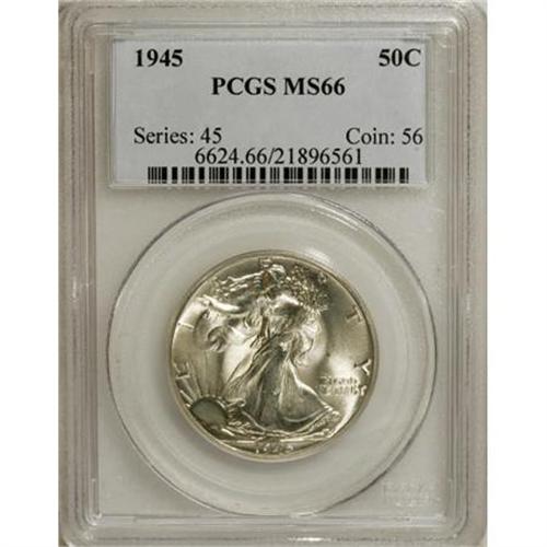 <B>1945 50C MS66 PCGS.</B></I> PCGS Population (1234/59). NGC Census: (1124/82). Mintage: 31,502,000. Numismedia Wsl. Price for NGC/PCGS coin in MS66: $200. (#6624)<BR><BR><B>Coin Engraver:</B> Adolph A. Weinman<BR><BR><b>Shipping:</b> Coins & Currency (<a target="_blank" href="http://www.heritageauctions.com/common/shipping.php">view shipping information</a>\)