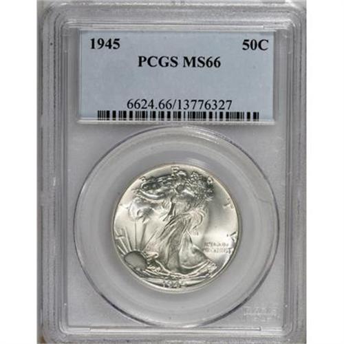 <B>1945 50C MS66 PCGS.</B></I> PCGS Population (1242/59). NGC Census: (1125/82). Mintage: 31,502,000. Numismedia Wsl. Price for NGC/PCGS coin in MS66: $200. (#6624)<BR><BR><B>Coin Engraver:</B> Adolph A. Weinman<BR><BR><b>Shipping:</b> Coins & Currency (<a target="_blank" href="http://www.heritageauctions.com/common/shipping.php">view shipping information</a>)