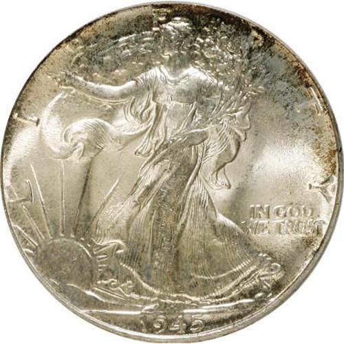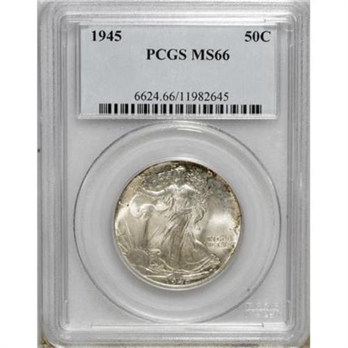 <B>1945 50C MS66 PCGS.</B></I> . PCGS Population (1258/59). NGC Census: (1199/87). Mintage: 31,502,000. Numismedia Wsl. Price for NGC/PCGS coin in MS66: $200. (#6624)<BR><BR><B>Coin Engraver:</B> Adolph A. Weinman<BR><BR><b>Shipping:</b> Coins & Currency (<a target="_blank" href="http://www.heritageauctions.com/common/shipping.php">view shipping information</a>)