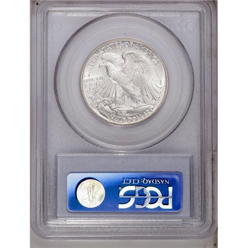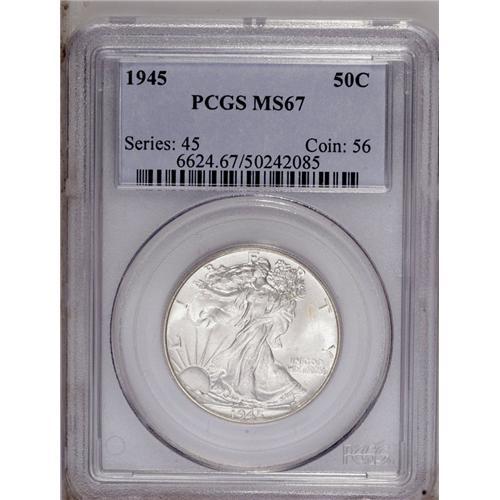 <B>1945<50C> MS67 PCGS.</B></I> Hints of gold color enrich this thoroughly lustrous and virtually pristine Superb Gem. The strike is bold, although not razor-sharp. Outstanding technical quality and imposing eye appeal confirm the high certified grade. An essentially unimprovable addition to an exemplary Walker short set, a piece that would never require an upgrade. Population: 56 in 67, 1 finer (1/06).