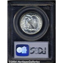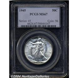 <B>1945<50C> MS67 PCGS.</B></I> A pristine, snow-white example that, for all intents and purposes, looks very much like a newly minted coin. Just a hint of pale golden color is detected at the base of the obverse border on very close examination. Far from the easiest short set Walker in this outstanding grade. Population: 43 in 67, 1 finer (7/04). <BR><BR><B>Important notice:</B> Heritage usually auctions material at the rate of 200-250 lots per hour. On some occasions eBay Live bid software or the Internet may not be able to keep up with the pace of the auction. We recommend placing a realistic absentee bid now as insurance to avoid disappointment. Occasionally the auctioneer may eliminate or reject an eBay Live bid, and the auctioneer may also reopen a lot after the close of the eBay live bidding (usually because we missed an audience bid), and may reject your bid even if it shows you as the winning bidder. By bidding via eBay Live, you agree that Heritage may award the lot to another bidder at its sole discretion under the circumstances described above or any other reasonable circumstances. Since eBay bids are not shown to us until we open the lot on the floor, we treat those bids just like floor bids. In most cases the floor responds before the eBay bid is presented to us, due to Internet lag time, so for consistency we have made it a policy that floor bids are always considered first over tie eBay live bids. Also please note that all Heritage lots purchased through eBay Live carry a 20% Buyer's Premium. Please make sure you read the Terms and Conditions before you bid. </span></font></tr></table></td></tr></table>