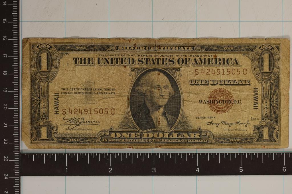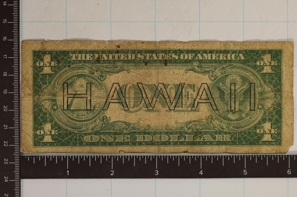 STAMPED WITH HAWAII SO IF THE ISLAND WAS OVERUN OUR CURRENCY WOULD BE WORTHLESS TO THE INVADING COUNTRY, ONE CORNER IS MISSING ON THE LOWER LEFT AND SOME SMALL STAINS NOTED