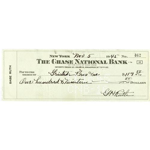 <B>1945 Babe Ruth Signed Check, Graded PSA Mint 9.</B></I> The Babe's appetites for booze, "broads" and food are well documented in baseball lore, the last of the three proven here as Ruth writes a massive $119.55 check for the grocer "Gristede Bros. Inc." Found in his most desirable format, with the "Babe Ruth" block lettered embossing at far left, this personal check was drawn against the Babe's personal account on the Upper West Side of Manhattan where he lived during the final years of his life. All black fountain pen ink is in the Babe's bold hand, earning a stellar rating of Mint 9 from the folks at PSA/DNA. It must be noted that the check has been affixed on the backside to a piece of mat board, though a skilled restorationist may well be able to remove it. The visual appeal of the piece is not affected in the slightest by this, and perhaps even serves to minimize the faint pair of vertical fold lines that are all but invisible already. When matted and framed below your favorite photo of this immortal Yankee, this check will impress even the most jaded of autograph collectors. <I>LOA from PSA/DNA.</B></I> <BR><BR><B>Important notice:</B> Heritage usually auctions material at the rate of 200-250 lots per hour. On some occasions eBay Live bid software or the Internet may not be able to keep up with the pace of the auction. We recommend placing a realistic absentee bid now as insurance to avoid disappointment. Occasionally the auctioneer may eliminate or reject an eBay Live bid, and the auctioneer may also reopen a lot after the close of the eBay live bidding (usually because we missed an audience bid), and may reject your bid even if it shows you as the winning bidder. By bidding via eBay Live, you agree that Heritage may award the lot to another bidder at its sole discretion under the circumstances described above or any other reasonable circumstances. Since eBay bids are not shown to us until we open the lot on the floor, we treat those bids just like floor bids. In most cases the floor responds before the eBay bid is presented to us, due to Internet lag time, so for consistency we have made it a policy that floor bids are always considered first over tie eBay live bids. Also please note that all Heritage lots purchased through eBay Live carry a 22.5% Buyer's Premium. Please make sure you read the Terms and Conditions before you bid. This lot is being auctioned in conjunction with a live floor auction by Heritage Galleries & Auctioneers. All final auction and invoice information will be supplied by Heritage Galleries & Auctioneers, and all other information should be considered preliminary. Lot:19083 <BR><BR><B>Winning Notification and Billing:</B> After the FINAL session in this auction is complete, Heritage will send e-mail and snail mail invoices. This process normally takes several days. All final auction and invoice information will be supplied by Heritage Galleries & Auctioneers, and all other information should be considered preliminary. <BR><BR>This auction will be conducted on a live auction floor and over the Internet through eBay Live. If you choose to place an absentee bid, please take a moment to <font color='#0000ff'><u><a href='http://pages.ebay.com/liveauctions/help/before/laabsentee.html'>learn how eBay Live absentee bidding works</a></u></font><font color='#000000'>
