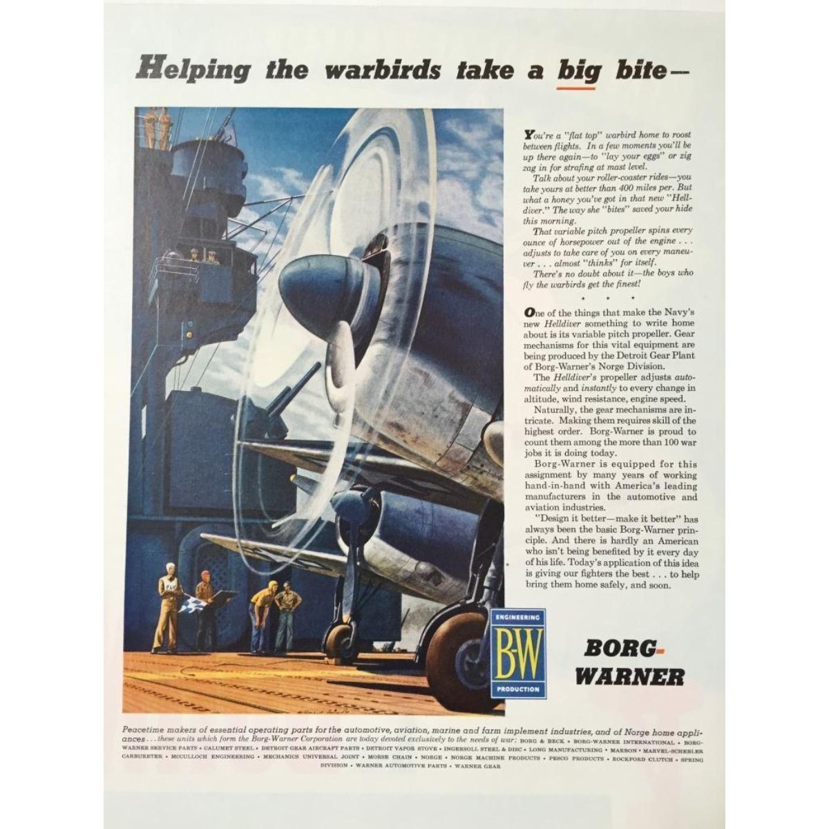 Original 1945 WWII magazine advertisement for B-W engineering Production, Borg-Warner Corporation, features propellers for the Navy's Helldriver planes on an aircraft carrier. Approx 11" X 13 1/2". Mounted on
