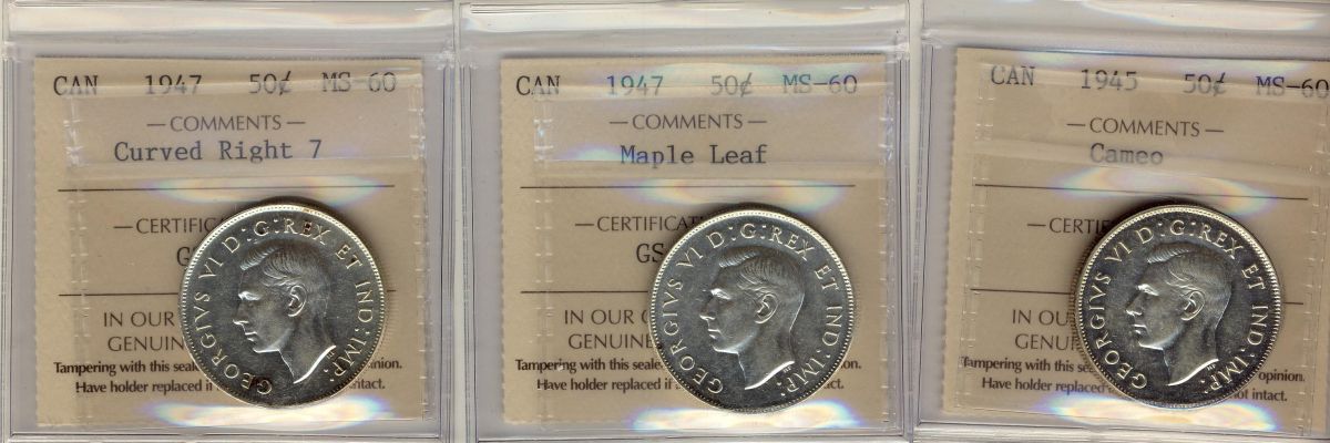 1945 Cameo, 1947 C7R and 1947 ML 50¢. Lot of three coins all ICCS MS60.