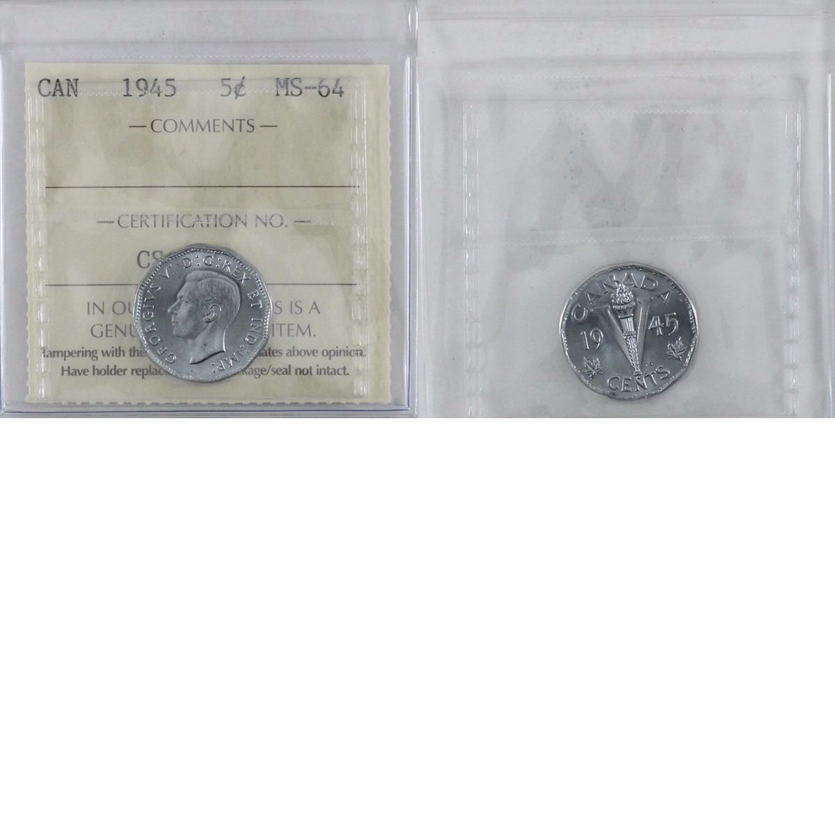 1945 Canada 5-cent ICCS Certified MS-64. Buyers Premium will be added on all items as per our terms of sale. We accept Paypal, Credit Card, E-Transfer Payments, Cheque or Money Orders (there is an additional 3% fee for using Paypal or Credit Card). All invoices will be emailed immediately following the auction, please contact us if you would like to pay by credit card or receive a new revised lower total for mailing in payment or sending an e-transfer (3% discount). All Items Are Sold "AS IS", no returns