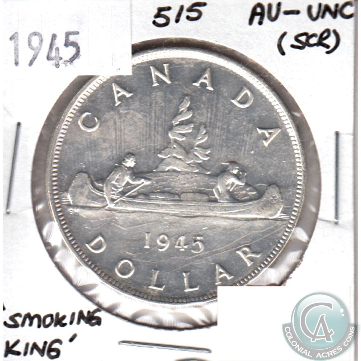 1945 Canada Silver $1 5/5 AU-UNC (Scratched). On the obverse of the Coin is a 'smoking king' scratched onto the coin.