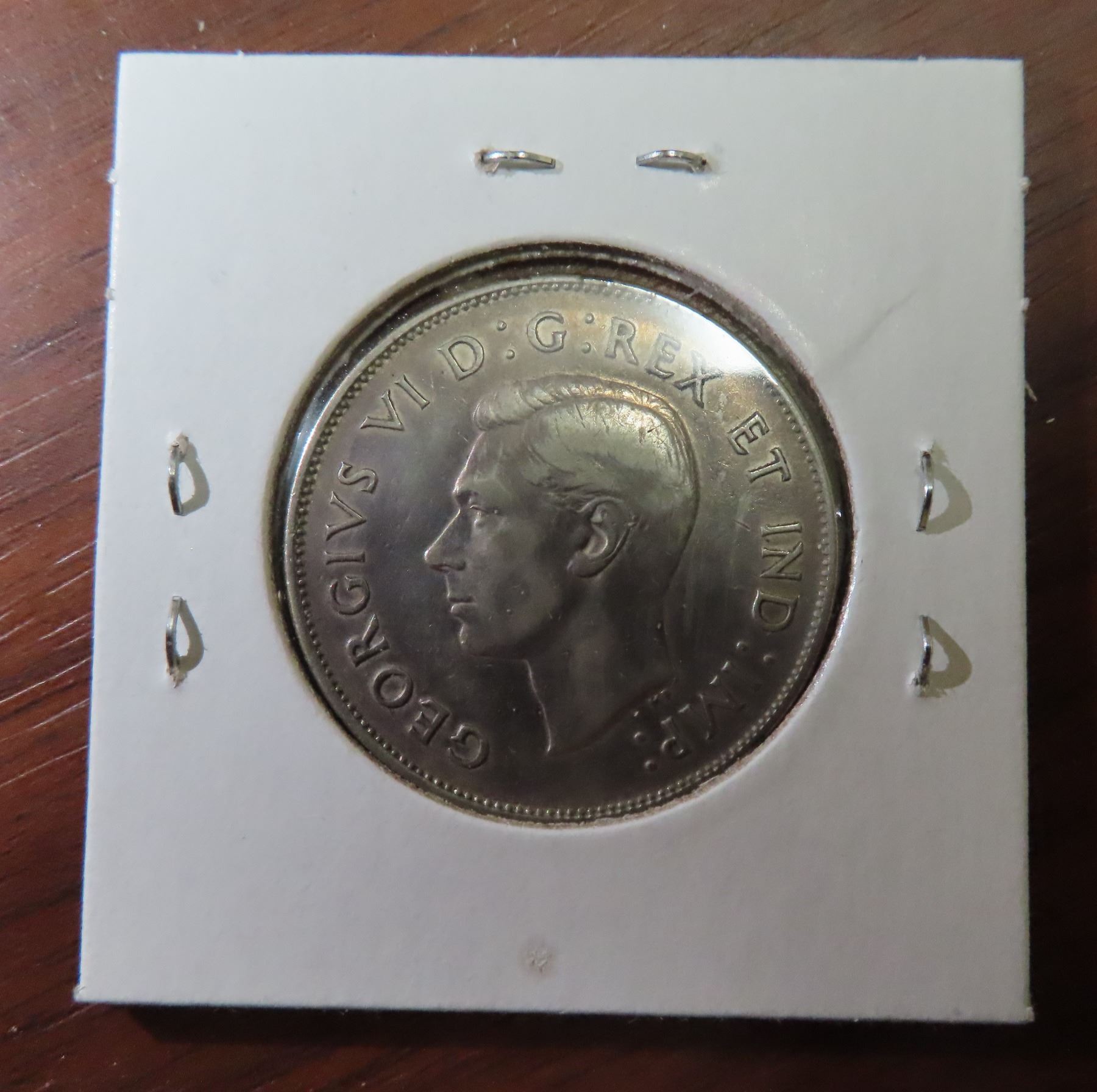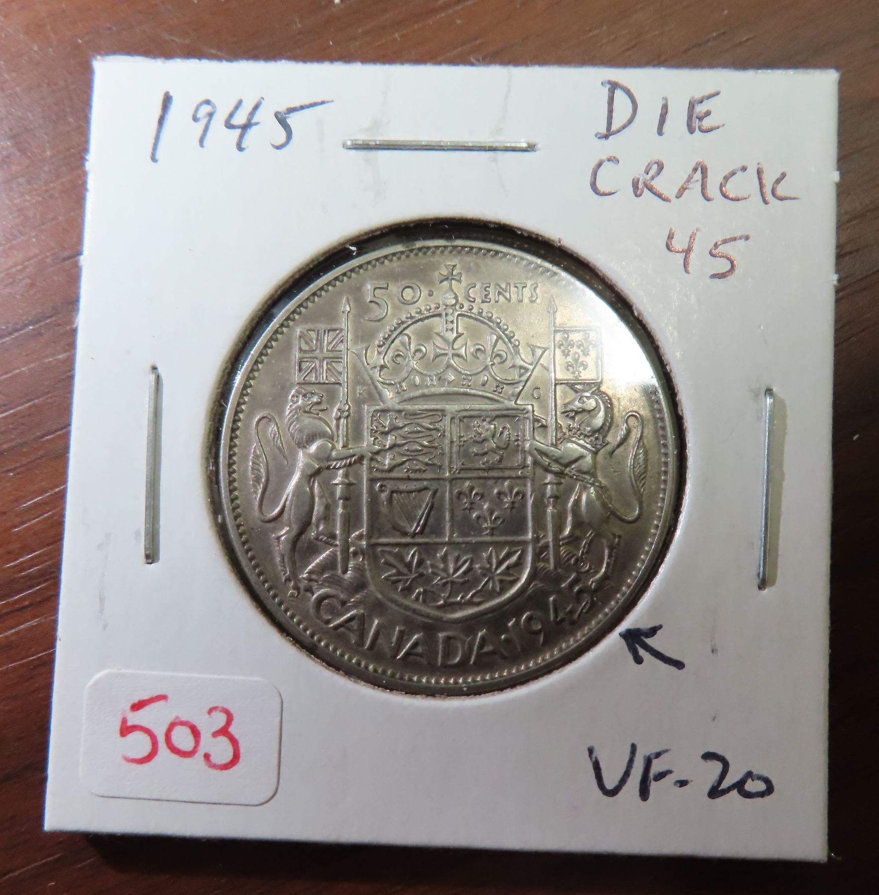 1945 Canadian Silver 50 Cents. Coin exhibits a Die Crack through the 4 & 5 in Date. VF-20.