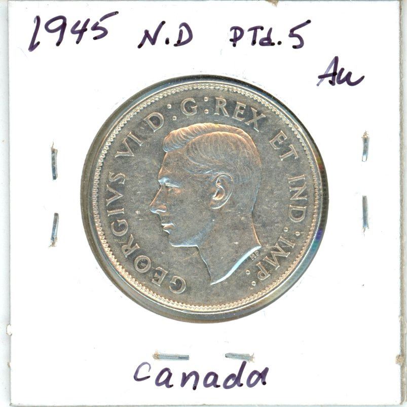 1945 Canadian silver 50 cent coin - Near Date ptd 5