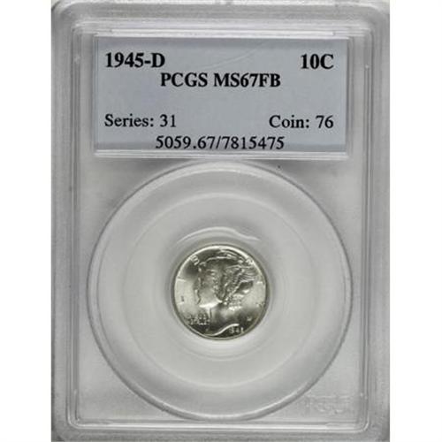 <B>1945-D 10C MS67 Full Bands PCGS.</B></I> PCGS Population (168/4). NGC Census: (296/8). Mintage: 40,245,000. Numismedia Wsl. Price for NGC/PCGS coin in MS67: $220. (#5059)<BR><BR><B>Coin Engraver:</B> Adolph A. Weinman<BR><BR><b>Shipping:</b> Coins & Currency (<a target="_blank" href="http://www.heritageauctions.com/common/shipping.php">view shipping information</a>)
