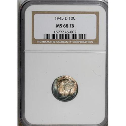 <B>1945-D 10C MS68 Full Bands NGC.</B></I> This crisply detailed and immensely lustrous final-year dime exhibits distinctive patina. While much of Liberty's cap is silver-white, the remainder of that side and most of the reverse show dappled turquoise, violet, russet, and rose toning. Census: 8 in 68 Full Bands, 0 finer (9/07).<BR><BR><B>Coin Engraver:</B> Adolph A. Weinman<BR><BR><b>Shipping:</b> Coins & Currency (<a target="_blank" href="http://www.heritageauctions.com/common/shipping.php">view shipping information</a>)