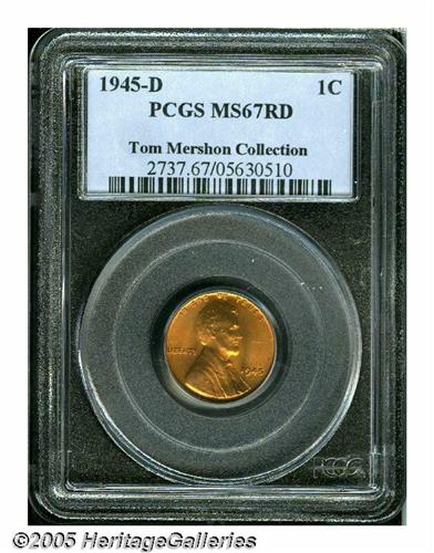 <B>1945-D<1C> MS67 Red PCGS.</B></I> Explosive reddish-orange luster blankets both sides of this sharp, attractive example. There is not a single blemish of note, and the eye appeal is nothing short of breathtaking.<BR><I>From The Tom Mershon #2 All-Time PCGS Registry Set of Lincoln Wheat Cents.</B></I>