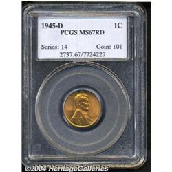 <B>1945-D<1C> MS67 Red PCGS.</B></I> Rich pumpkin-orange and rose shades emanate from the shimmering surfaces.<BR><I>From The Kyle Patrick collection of Lincoln Cents.</B></I> <BR><BR><B>Important notice:</B> Heritage usually auctions material at the rate of 200-250 lots per hour. On some occasions eBay Live bid software or the Internet may not be able to keep up with the pace of the auction. We recommend placing a realistic absentee bid now as insurance to avoid disappointment. Occasionally the auctioneer may eliminate or reject an eBay Live bid, and the auctioneer may also reopen a lot after the close of the eBay live bidding (usually because we missed an audience bid), and may reject your bid even if it shows you as the winning bidder. By bidding via eBay Live, you agree that Heritage may award the lot to another bidder at its sole discretion under the circumstances described above or any other reasonable circumstances. Since eBay bids are not shown to us until we open the lot on the floor, we treat those bids just like floor bids. In most cases the floor responds before the eBay bid is presented to us, due to Internet lag time, so for consistency we have made it a policy that floor bids are always considered first over tie eBay live bids. Also please note that all Heritage lots purchased through eBay Live carry a 20% Buyer's Premium. Please make sure you read the Terms and Conditions before you bid.