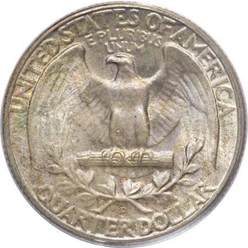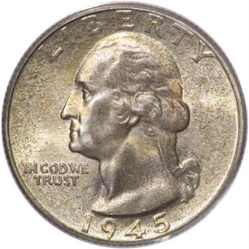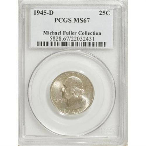 <B>1945-D 25C MS67 PCGS.</B></I> The strongly lustrous surfaces offer delightful hints of frost. The margins are largely silver-white, though elements of lavender, denim-blue, and gold grace the centers. Pleasingly detailed with exquisite preservation and eye appeal to match. PCGS has graded just 18 pieces as MS67, with none finer (10/07).<BR><I>From The Michael Fuller Collection.</B></I><BR><BR><B>Coin Engraver:</B> John Flanagan<BR><BR><b>Shipping:</b> Coins & Currency (<a target="_blank" href="http://www.heritageauctions.com/common/shipping.php">view shipping information</a>)