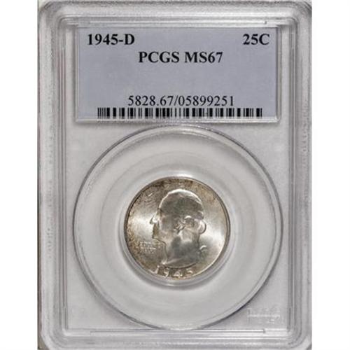 <B>1945-D 25C MS67 PCGS.</B></I> Like many Washington quarters of the 1940s, this issue is readily obtainable in grades up to, and including MS66. But in MS67, this issue is elusive and in heavy demand from specialists. This example has extremely clean surfaces with ample satiny luster. A little bit of speckled russet tone is seen at the obverse peripheries. Population: 19 in 67, 0 finer (12/07).<BR><BR><B>Coin Engraver:</B> John Flanagan<BR><BR><b>Shipping:</b> Coins & Currency (<a target="_blank" href="http://www.heritageauctions.com/common/shipping.php">view shipping information</a>)