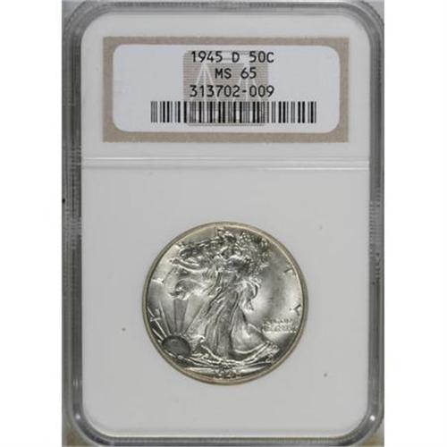 <B>1945-D 50C MS65 NGC.</B></I> NGC Census: (3188/1737). PCGS Population (4744/1648). Mintage: 9,966,800. Numismedia Wsl. Price for NGC/PCGS coin in MS65: $145. (#6625)<BR><BR><B>Coin Engraver:</B> Adolph A. Weinman<BR><BR><b>Shipping:</b> Coins & Currency (<a target="_blank" href="http://www.heritageauctions.com/common/shipping.php">view shipping information</a>)