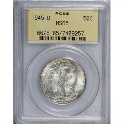 <B>1945-D 50C MS65 PCGS.</B></I> PCGS Population (4630/1595). NGC Census: (3110/1703). Mintage: 9,966,800. Numismedia Wsl. Price for NGC/PCGS coin in MS65: $144. (#6625)<BR><BR><B>Coin Engraver:</B> Adolph A. Weinman<BR><BR><b>Shipping:</b> Coins & Currency (<a target="_blank" href="http://www.heritageauctions.com/common/shipping.php">view shipping information</a>\)