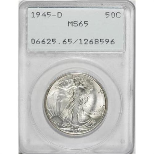 <B>1945-D 50C MS65 PCGS.</B></I> PCGS Population (4645/1598). NGC Census: (3120/1706). Mintage: 9,966,800. Numismedia Wsl. Price for NGC/PCGS coin in MS65: $145. (#6625)<BR><BR><B>Coin Engraver:</B> Adolph A. Weinman<BR><BR><b>Shipping:</b> Coins & Currency (<a target="_blank" href="http://www.heritageauctions.com/common/shipping.php">view shipping information</a>)