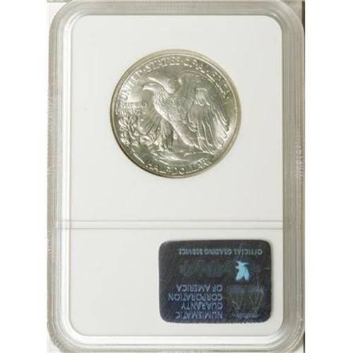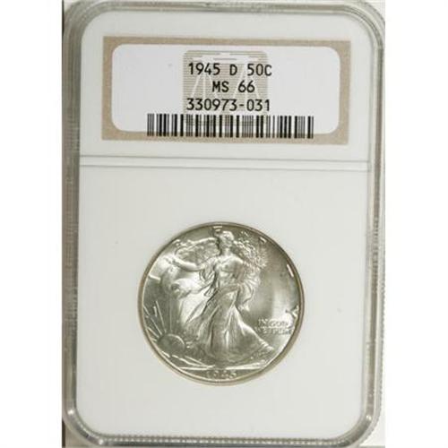 <B>1945-D 50C MS66 NGC.</B></I> NGC Census: (1580/126). PCGS Population (1507/110). Mintage: 9,966,800. Numismedia Wsl. Price for NGC/PCGS coin in MS66: $200. (#6625)<BR><BR><B>Coin Engraver:</B> Adolph A. Weinman<BR><BR><b>Shipping:</b> Coins & Currency (<a target="_blank" href="http://www.heritageauctions.com/common/shipping.php">view shipping information</a>)