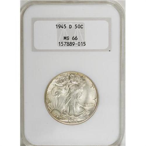 <B>1945-D 50C MS66 NGC.</B></I> NGC Census: (1580/126). PCGS Population (1507/110). Mintage: 9,966,800. Numismedia Wsl. Price for NGC/PCGS coin in MS66: $200. (#6625)<BR><BR><B>Coin Engraver:</B> Adolph A. Weinman<BR><BR><b>Shipping:</b> Coins & Currency (<a target="_blank" href="http://www.heritageauctions.com/common/shipping.php">view shipping information</a>)
