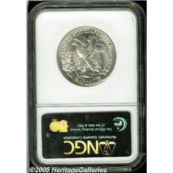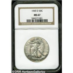 <B>1945-D 50C MS67 NGC.</B></I> Well struck with just a bit of typical striking weakness on Liberty's thumb, this shimmering Superb Gem is brilliant and exquisitely preserved, showing just a couple of tiny marks on bright, satin-finished surfaces. A truly beautiful Walker. Population: 123 in 67, 0 finer (2/05).