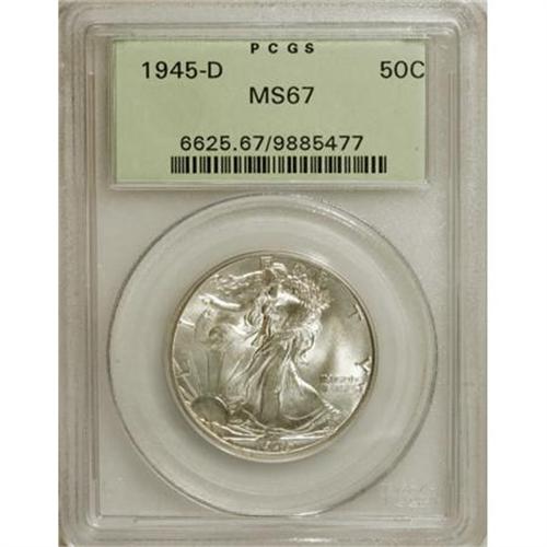 <B>1945-D 50C MS67 PCGS.</B></I> PCGS Population (109/0). NGC Census: (125/1). Mintage: 9,966,800. Numismedia Wsl. Price for NGC/PCGS coin in MS67: $900. (#6625)<BR><BR><B>Coin Engraver:</B> Adolph A. Weinman<BR><BR><b>Shipping:</b> Coins & Currency (<a target="_blank" href="http://www.heritageauctions.com/common/shipping.php">view shipping information</a>\)