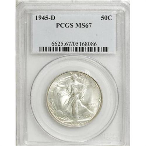 <B>1945-D 50C MS67 PCGS.</B></I> Glowing luster emanates from light silver-gold surfaces that have been impeccably preserved. A reasonable strike brings out nice definition on the design elements. PCGS has seen none finer (1/08).<BR><BR><B>Coin Engraver:</B> Adolph A. Weinman<BR><BR><b>Shipping:</b> Coins & Currency (<a target="_blank" href="http://www.heritageauctions.com/common/shipping.php">view shipping information</a>)