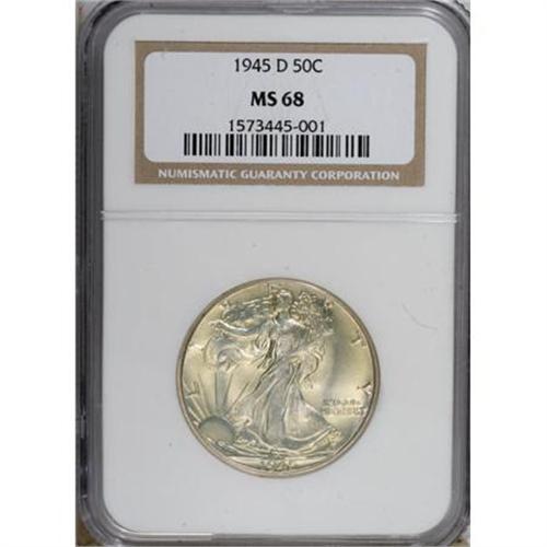 <B>1945-D 50C MS68 NGC.</B></I> The finest example of this issue certified at either service, and as such destined to keenly interest Registry Set collectors. Even, light golden toning covers each side with strong underlying mint luster. As one would expect, there are no obvious abrasions on either side. Fully struck also, this is an immaculate type coin.<BR><BR><b>Shipping:</b> Coins & Currency (<a target="_blank" href="http://www.heritageauctions.com/common/shipping.php">view shipping information</a>)