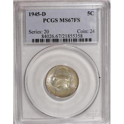 <B>1945-D 5C MS67 Full Steps PCGS.</B></I> PCGS Population (66/0). NGC Census: (33/0). (#84026)<BR><BR><b>Shipping:</b> Coins & Currency (<a target="_blank" href="http://www.heritageauctions.com/common/shipping.php">view shipping information</a>)