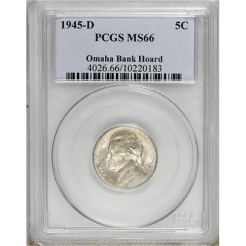<B>1945-D 5C MS66 PCGS.</B></I> Ex: Omaha Bank Hoard. PCGS Population (1733/111). NGC Census: (1863/2047). Mintage: 37,158,000. Numismedia Wsl. Price for NGC/PCGS coin in MS66: $21. (#4026)<BR><BR><B>Coin Engraver:</B> Felix Schlag<BR><BR><b>Shipping:</b> Coins & Currency (<a target="_blank" href="http://www.heritageauctions.com/common/shipping.php">view shipping information</a>)