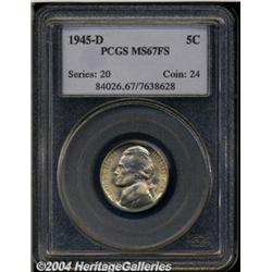 <B>1945-D<5C> MS67 Full Steps PCGS.</B></I> A satiny Premium Gem that has honey-gold color with a splash of pale violet, a sharp strike, and pleasing surfaces. A hardly noticeable tick or two occurs on the primary design of each side. Population: 50 in 67, 0 finer (3/04). <BR><BR><B>Important notice:</B> Heritage usually auctions material at the rate of 200-250 lots per hour. On some occasions eBay Live bid software or the Internet may not be able to keep up with the pace of the auction. We recommend placing a realistic absentee bid now as insurance to avoid disappointment. Occasionally the auctioneer may eliminate or reject an eBay Live bid, and the auctioneer may also reopen a lot after the close of the eBay live bidding (usually because we missed an audience bid), and may reject your bid even if it shows you as the winning bidder. By bidding via eBay Live, you agree that Heritage may award the lot to another bidder at its sole discretion under the circumstances described above or any other reasonable circumstances. Since eBay bids are not shown to us until we open the lot on the floor, we treat those bids just like floor bids. In most cases the floor responds before the eBay bid is presented to us, due to Internet lag time, so for consistency we have made it a policy that floor bids are always considered first over tie eBay live bids. Also please note that all Heritage lots purchased through eBay Live carry a 20% Buyer's Premium. Please make sure you read the Terms and Conditions before you bid.