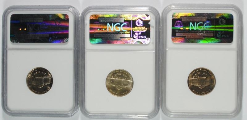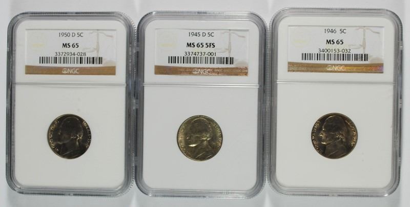 1945-D 5FS, 1946 & 1950-D JEFFERSON NICKELS, NGC MS-65