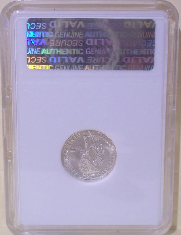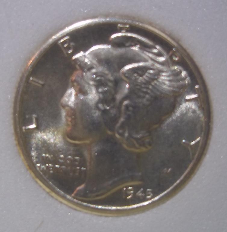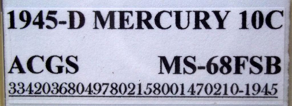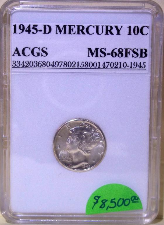 1945 Denver Mint Mercury Dime, certified and graded Mint State 68 Full Split Bands by ACGS! Only the first strike coins have the coveted Full Split Bands reverse, and they sell for many times the price of more common strikes. The Dimes featured today are all from the estate of a fanatic collector who ONLY accepted the very highest grade coins available. The widow has NO INTEREST WHAT SO EVER in coin collecting, and she wants them GONE!