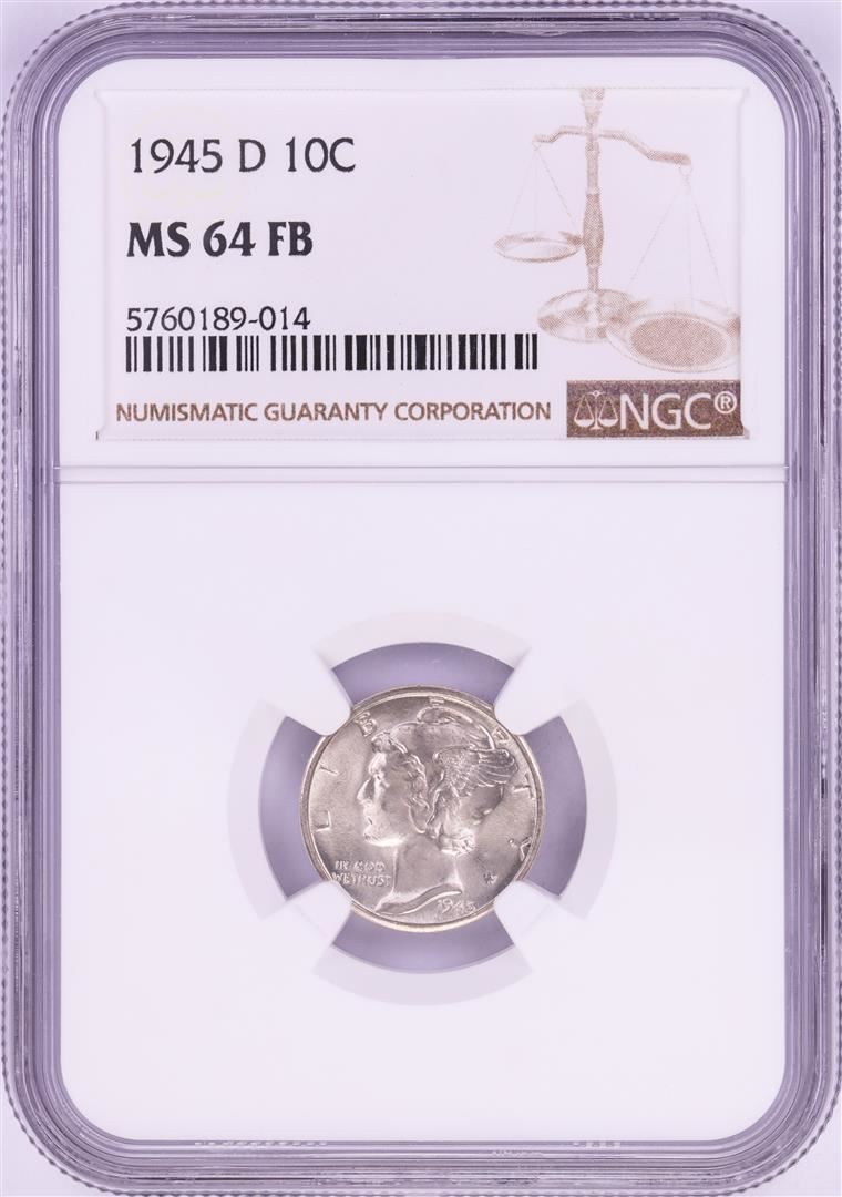 One 1945-D Mercury Dime Coin NGC MS64FB. NGC Certified.