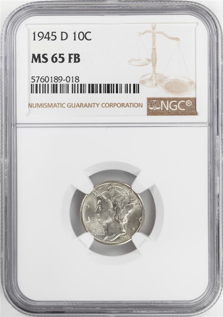 One 1945-D Mercury Dime Coin NGC MS65FB. NGC Certified.