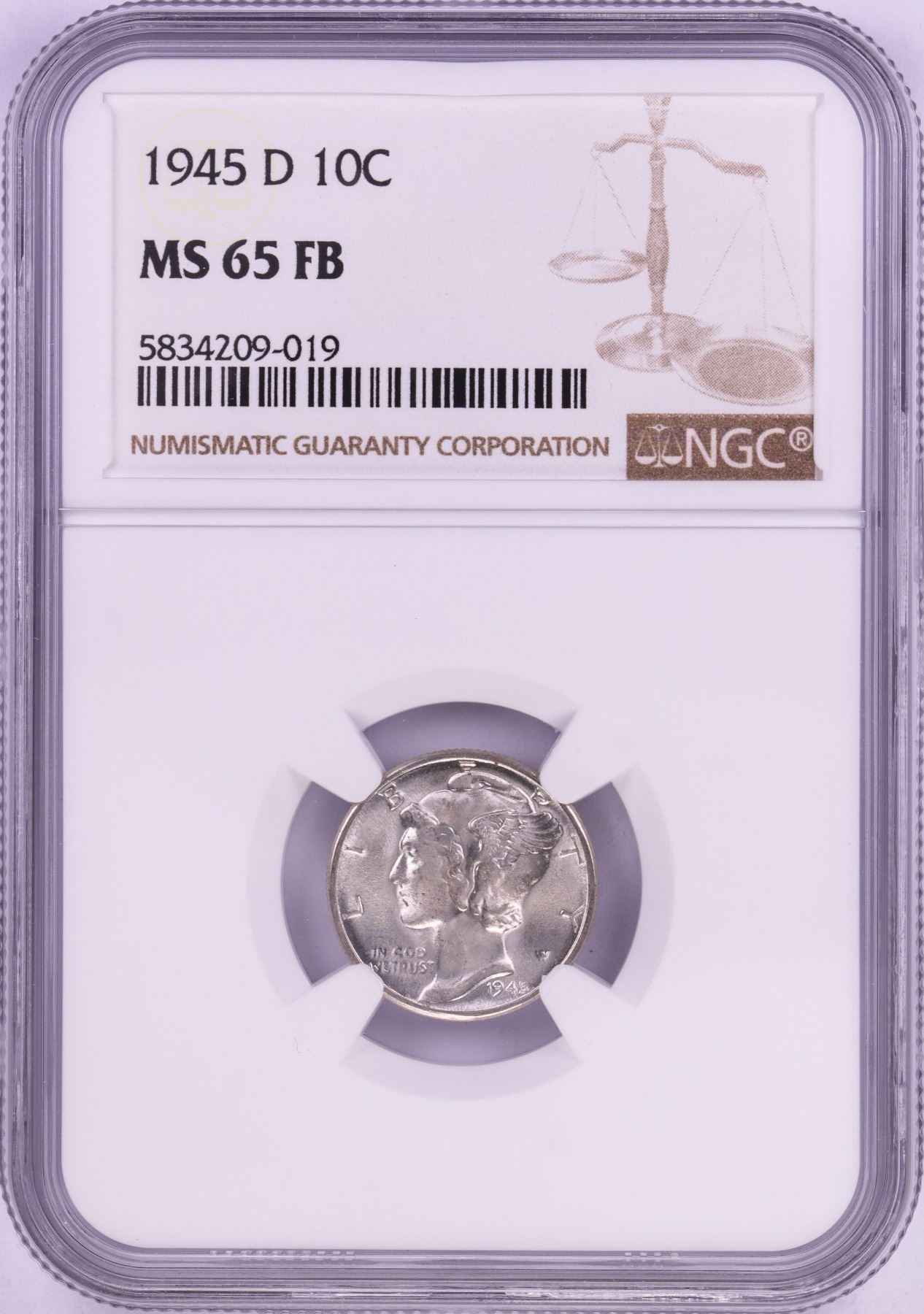 One 1945-D Mercury Dime Coin NGC MS65FB.