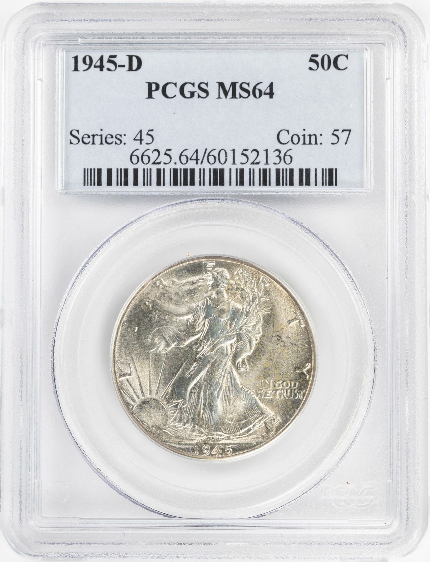 One 1945-D Walking Liberty Half Dollar Coin PCGS MS64.