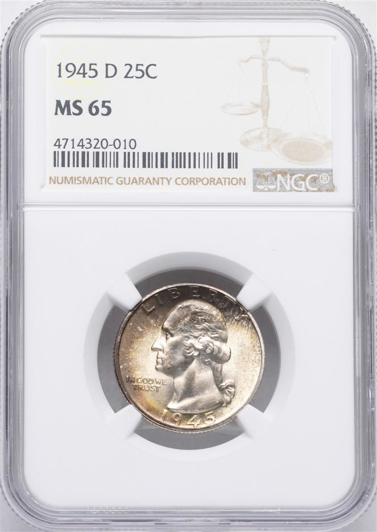 One 1945-D Washington Quarter Coin NGC MS65. NGC Certified.