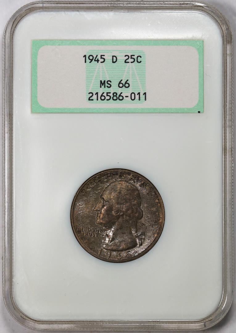 One 1945-D Washington Quarter Coin NGC MS66 Old Fatty Holder Nice Toning. NGC Certified.