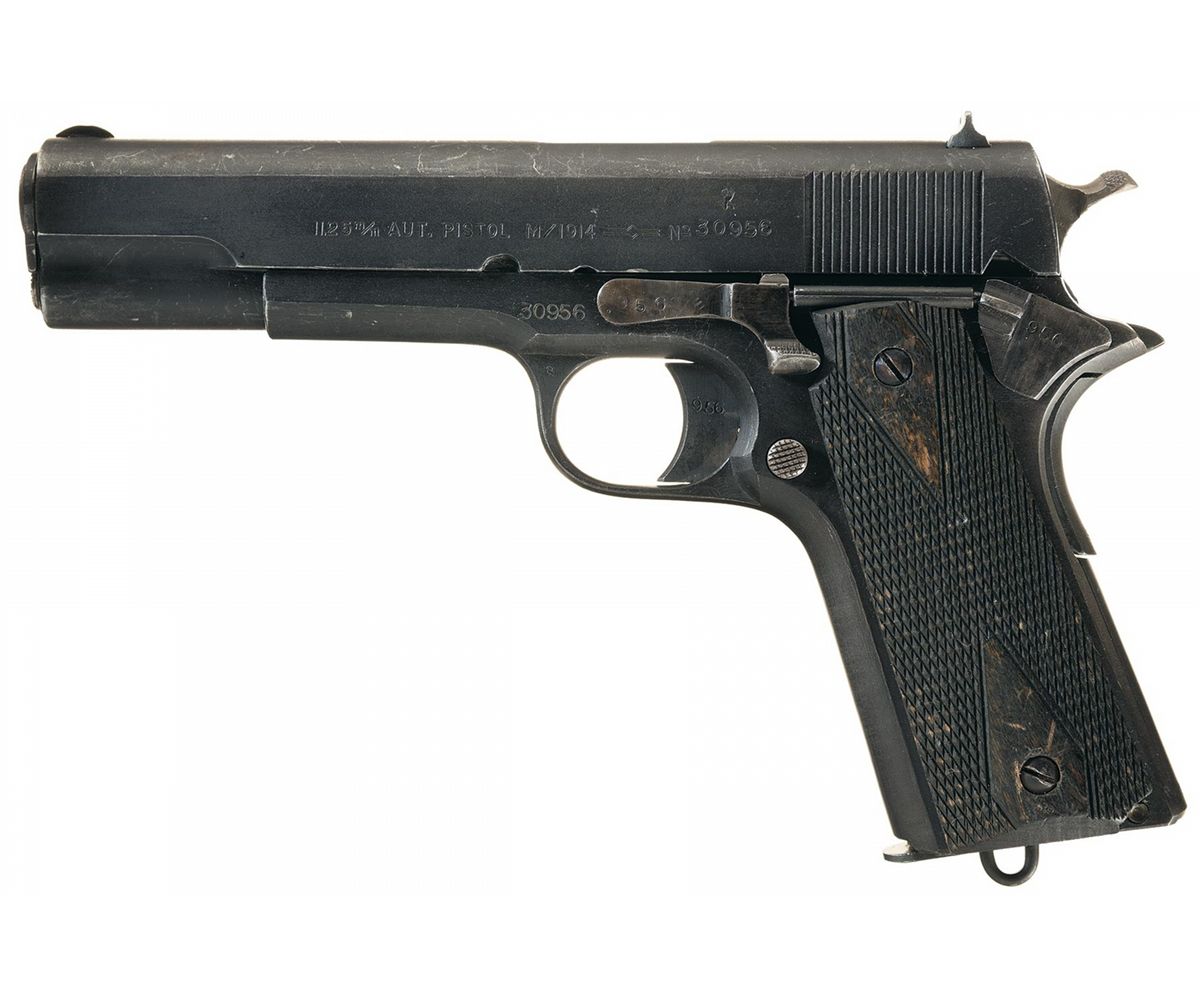 Very fine. The pistol retains 90% plus original phosphate finish showing some thinning to a gray and an area of smooth gray on the frame (right side). A number of scratches are present on the slide. The grips are excellent with a few minor handling marks and overall crisp checkering.