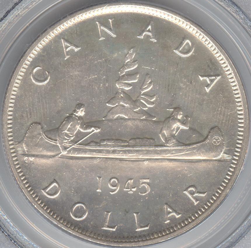 1945 Dollar, graded PCGS MS-63. Not noted is 5/5.